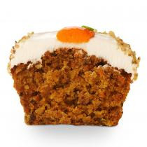 Carrot cake topped with vanilla cream cheese frosting, edged in crushed walnuts and decorated with a buttercream carrot.