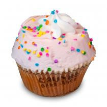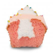 Pink vanilla cake filled with vanilla buttercream and topped with pink vanilla cream cheese frosting, confetti quins and a vanilla buttercream rosette.