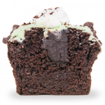 Rich chocolate cake filled with chocolate fudge and topped with mint flavored cream cheese frosting with chocolate cake crumbs, edged in mini chocolate chips with a vanilla buttercream rosette.