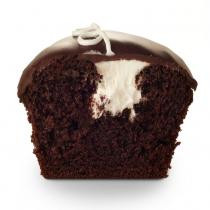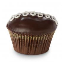 Chocolate cake filled with vanilla buttercream and covered in chocolate ganache icing with a buttercream squiggle on top.